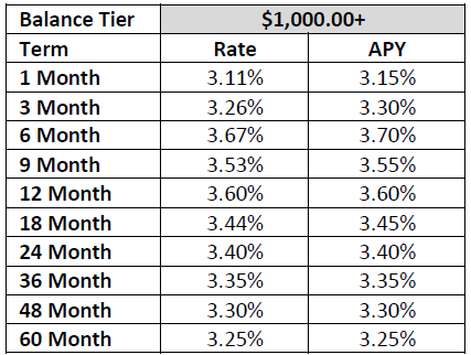 | Term | Rate/APY $1,000 - $249,999.99 |